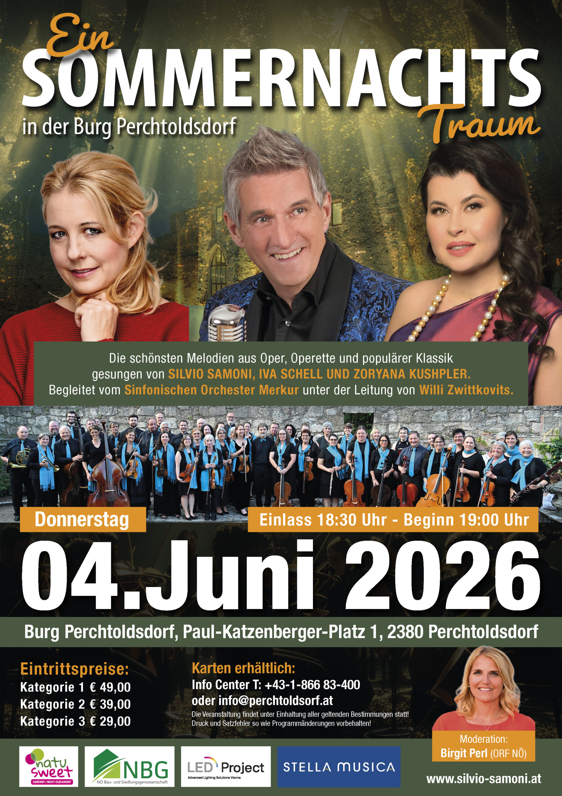 Gesungen von Silvio Samoni, Iva Schell und Zoryana Kushpler. Begleitet vom Sinfonischen Orchester Merkur unter der Leitung von Willi Zwittkovits. Karten erhältlich: Info Center Perchtoldsdorf T: +43-1-866 83-400 oder info@perchtoldsdorf.at