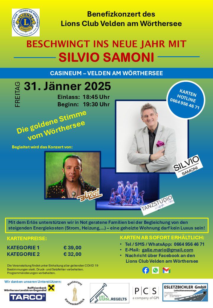 Jänner, 2025 Beschwingt ins neue Jahr mit Silvio Samoni - Casineum am See- Veranstalter: Lions Club Velden am Wörthersee - FR31JAN19:3022:00Beschwingt ins neue Jahr mit Silvio Samoni - Casineum am See- Veranstalter: Lions Club Velden am Wörthersee -19:30 - 22:00 Zeit(FREITAG) 19:30 - 22:00 KalenderGoogle Kalender