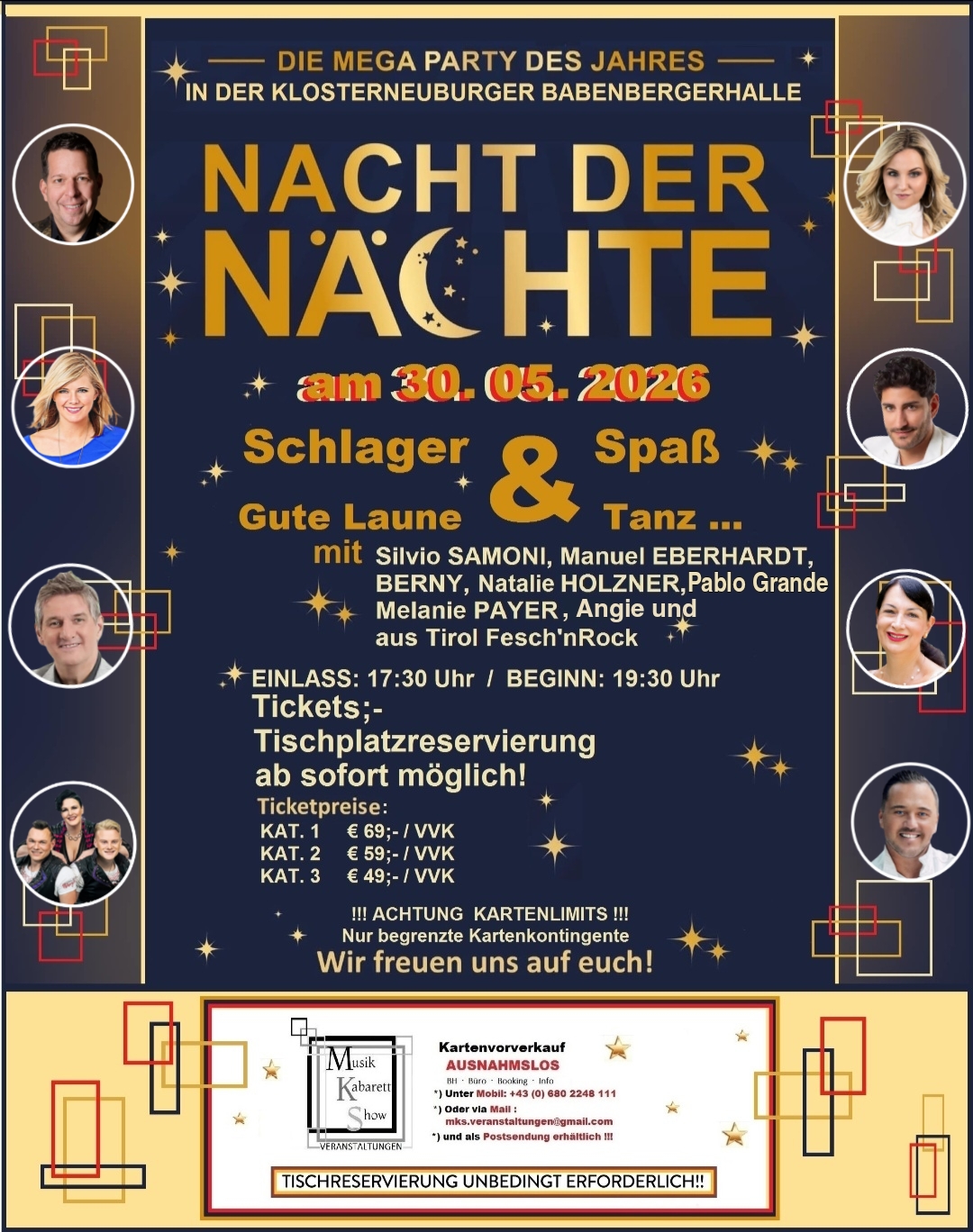SA30MAI19:3022:30A-3400 Klosterneuburg, Babenbergerhalle - Schlagernacht mit Melanie Payer, Silvio Samoni, Natalie Holzner u.a.19:30 - 22:30
