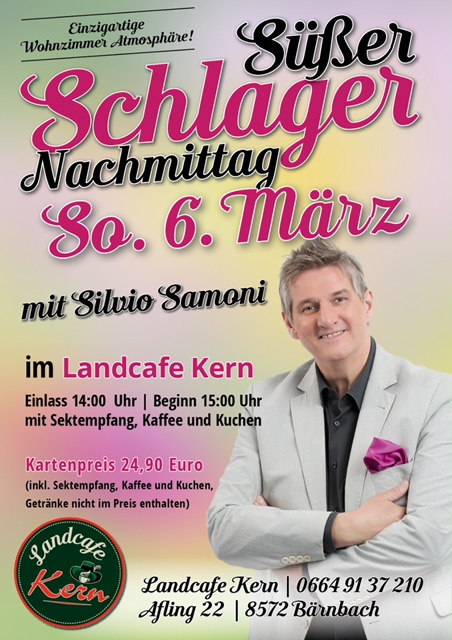 März, 2022 Süßer Schlager - Nachmittag im Landcafe Kern, Afling 22, 8572 Bärnbach SO06MÄR15:0018:00Süßer Schlager - Nachmittag im Landcafe Kern, Afling 22, 8572 Bärnbach15:00 - 18:00 Zeit(SONNTAG) 15:00 - 18:00 KalenderGoogle Kalender