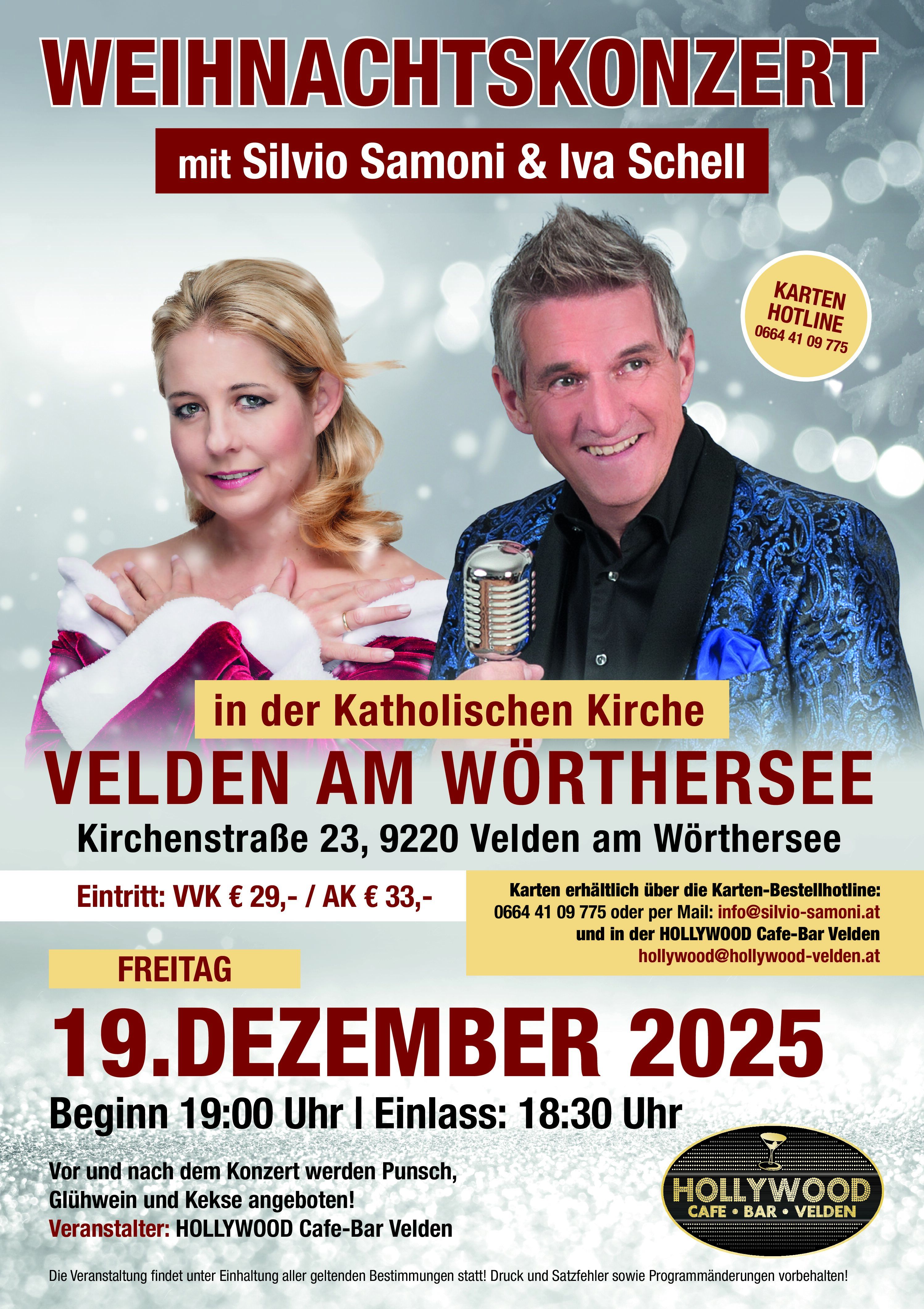 Karten erhältlich in der HOLLYWOOD Cafe-Bar Velden hollywood@hollywood-velden.at und unter info@silvio-samoni.at und über die Karten-Bestell-Hotline 0664 - 41 09 775
